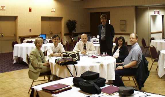 Early WIDA days gathering, with, from left, Margo Gottlieb, Jim McCobb (Vermont SEA), Jim Bauman (CAL), Fred Davidson (U of I), Meg Malone (CAL) and WIDA Founder and Director Tim Boals.